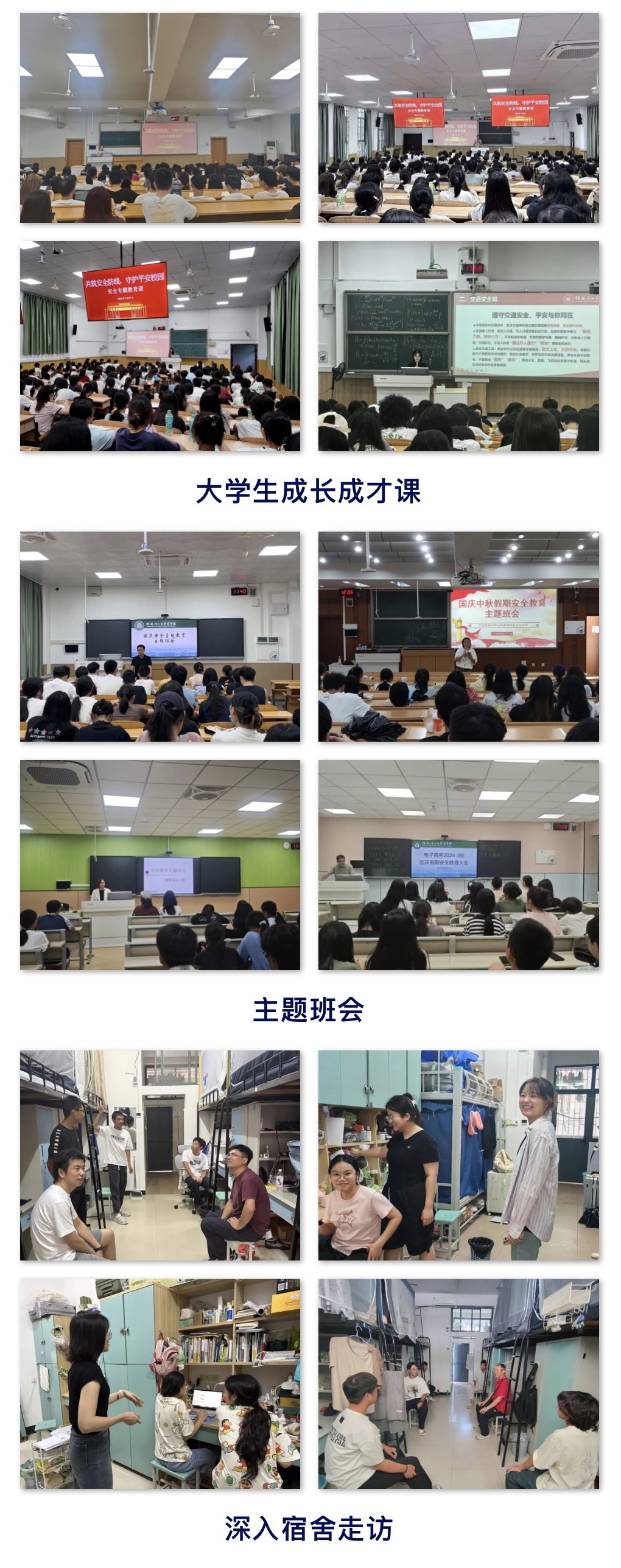 為切實做好國慶、中秋假期安全穩定工作,進一步增強學生安全防范意識,營造安全、文明、和諧的校園環境,學院于9月25日—30日,通過多種形式開展安全主題教育,為學生的假期安全保駕護航。學院以大學生成長成才課、主題班會為陣地,重點從假期學生管理規定、人身安全、交通安全、財產安全、出行安全、網絡安全、宿舍安全、飲食安全、防火防盜、電信詐騙、防溺水等方面進行教育,切實增強學生安全防范意識。輔導員、班主任深入宿...