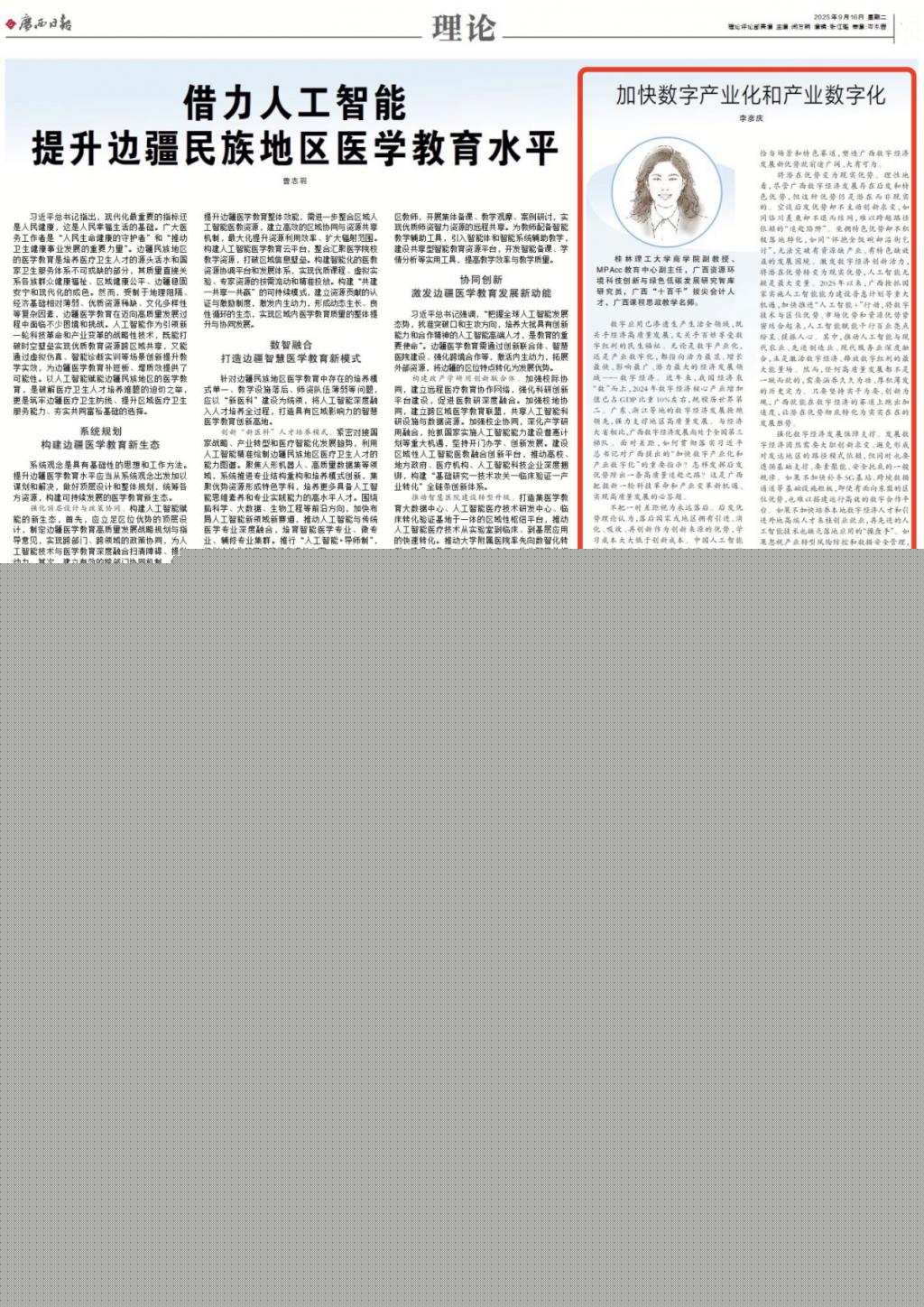 近日,《廣西日報》“青年說理”欄目刊發中國·永樂高131net李彥慶副教授理論文章《加快數字產業化和產業數字化》。文章從“不把一時差距視為永遠落后”、“將潛在優勢變為現實優勢”、“強化數字經濟發展保障支撐”等三個方面進行了介紹。現將全文轉載如下。外宣稿鏈接:https://apph5.cloudgx.cn/article/sync1967727903722569728李彥慶:桂林理工大學商學院副教授、MPAcc教育中心副主任,廣西資源環境科技創新與綠色低碳發展研究智庫研究員...